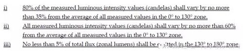 規范了全向燈光分布的標準要求,增加了“全向燈0-130環帶內光強值與所有平均值的變化不超過60%”,并且附上了自動計算公式。此要求來源于“CEC Title 20 15-Day Notice”,如下圖所示。